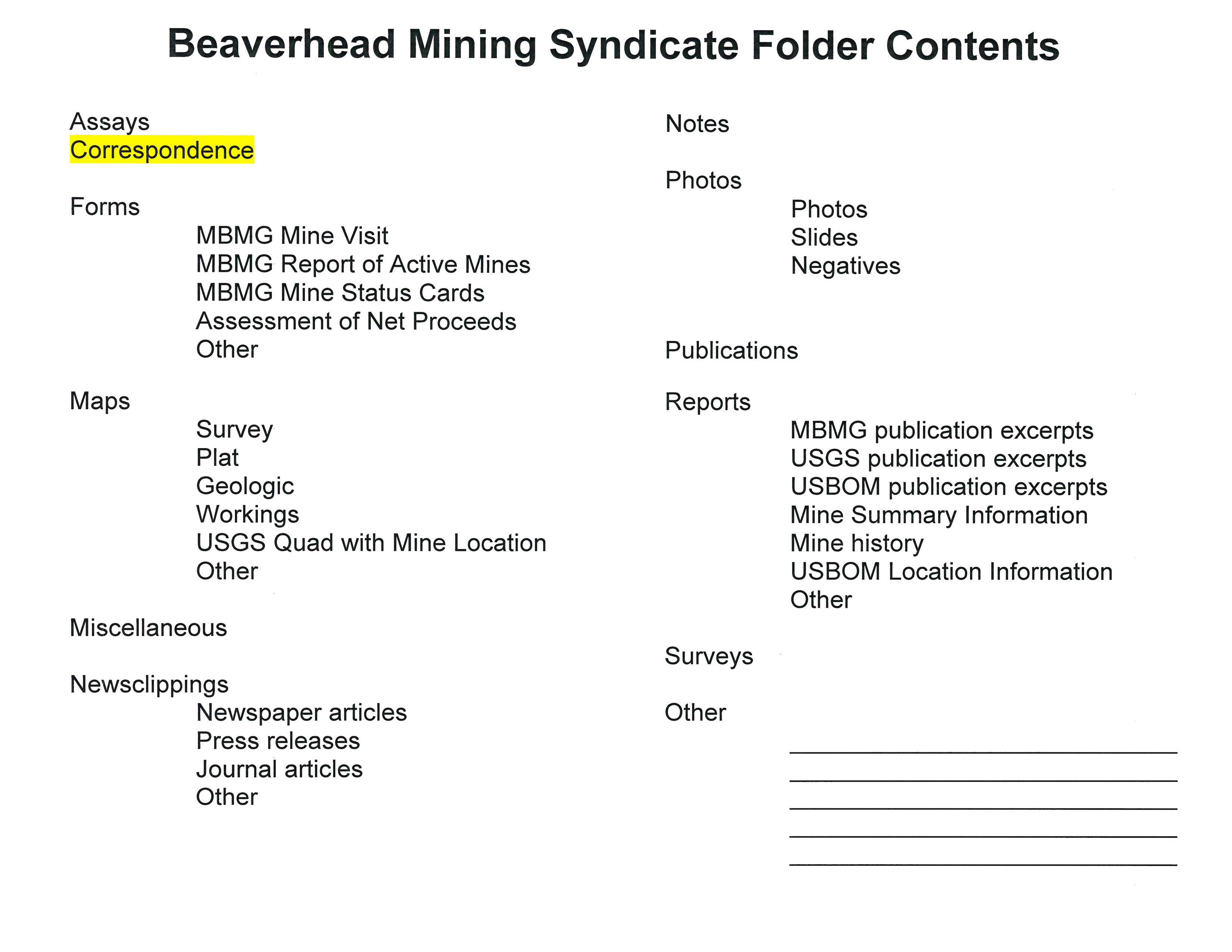 - "Beaverhead Mining Syndicate Folder Contents", Beaverhead Mine Documents, Montana Bureau of Mines and Geology
