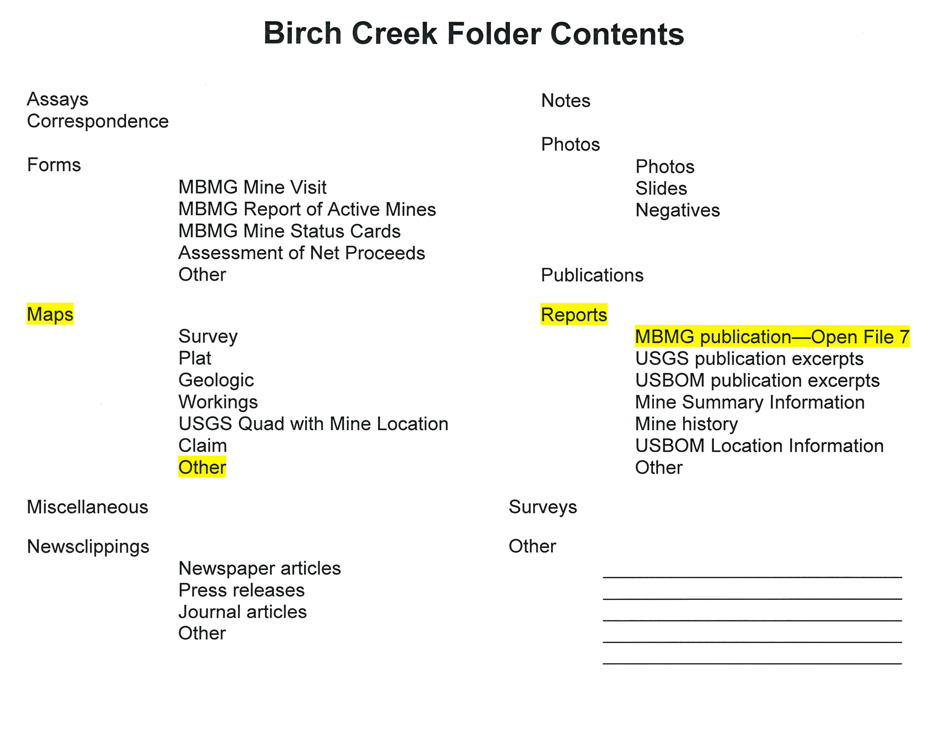 - "Birch Creek Folder Contents", Beaverhead Mine Documents, Montana Bureau of Mines and Geology