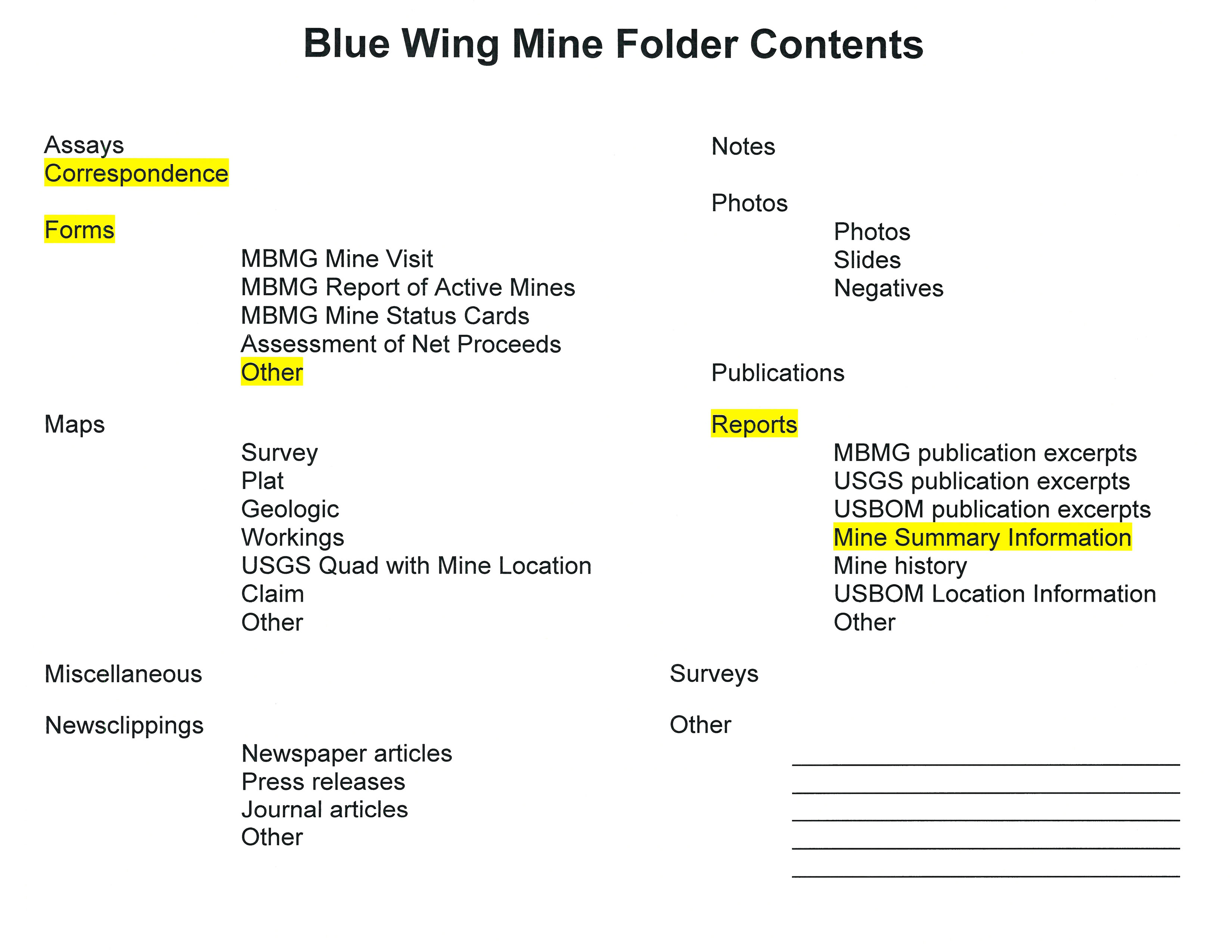 - "Blue Wing Mine Folder Contents", Beaverhead Mine Documents, Montana Bureau of Mines and Geology