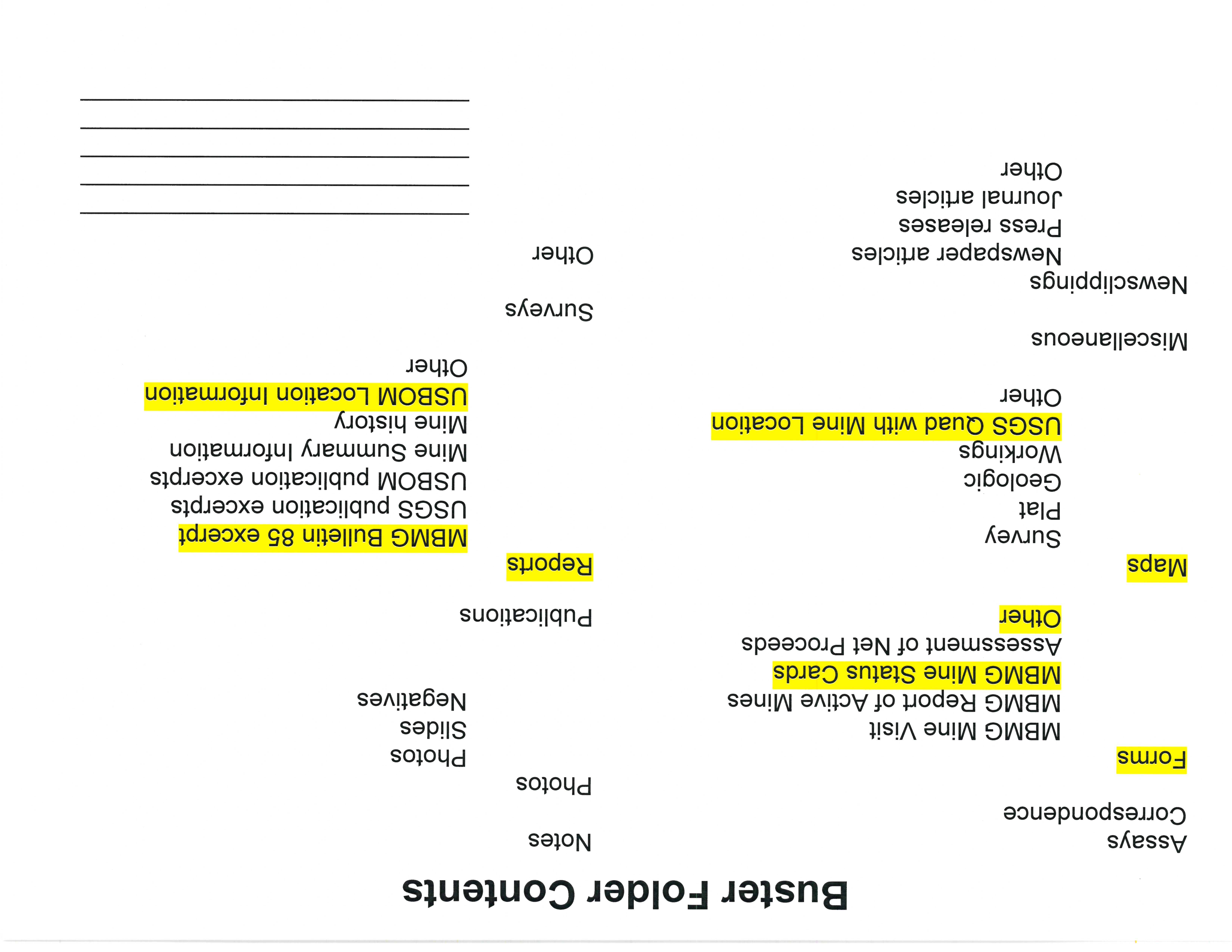 - "Buster Folder Contents", Beaverhead Mine Documents, Montana Bureau of Mines and Geology