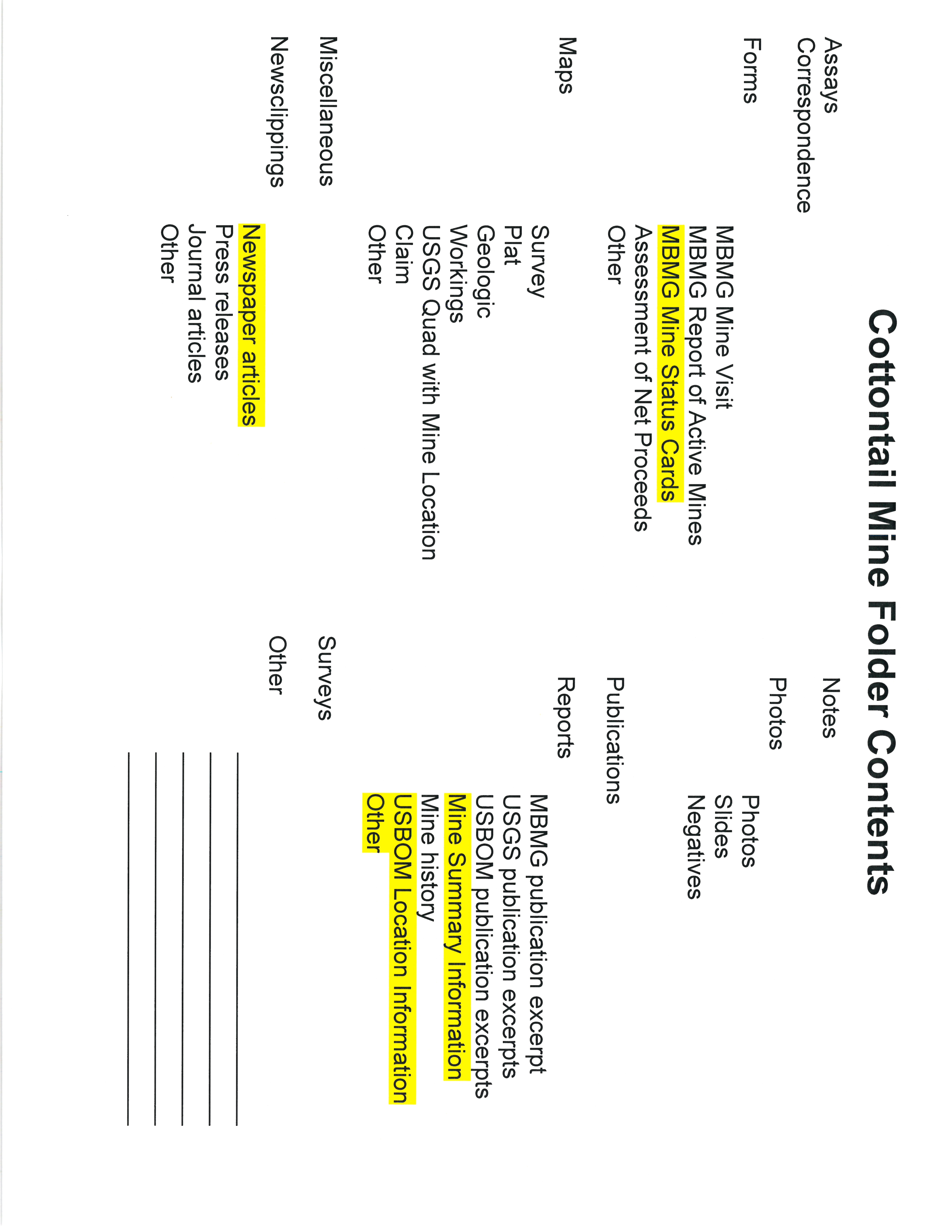 - "Cottontail Mine Folder Contents", Beaverhead Mine Documents, Montana Bureau of Mines and Geology