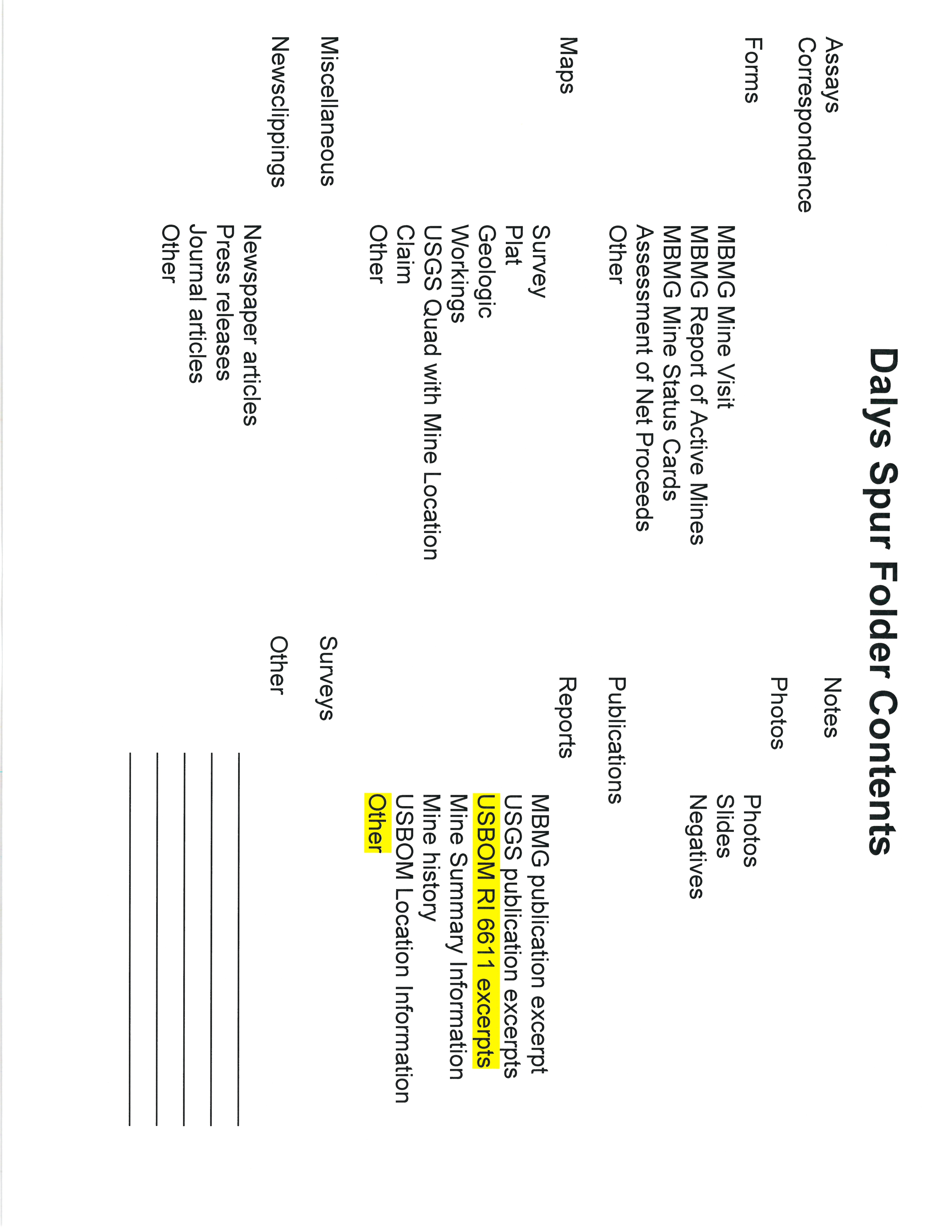 - "Dalys Spur Folder Contents", Beaverhead Mine Documents, Montana Bureau of Mines and Geology