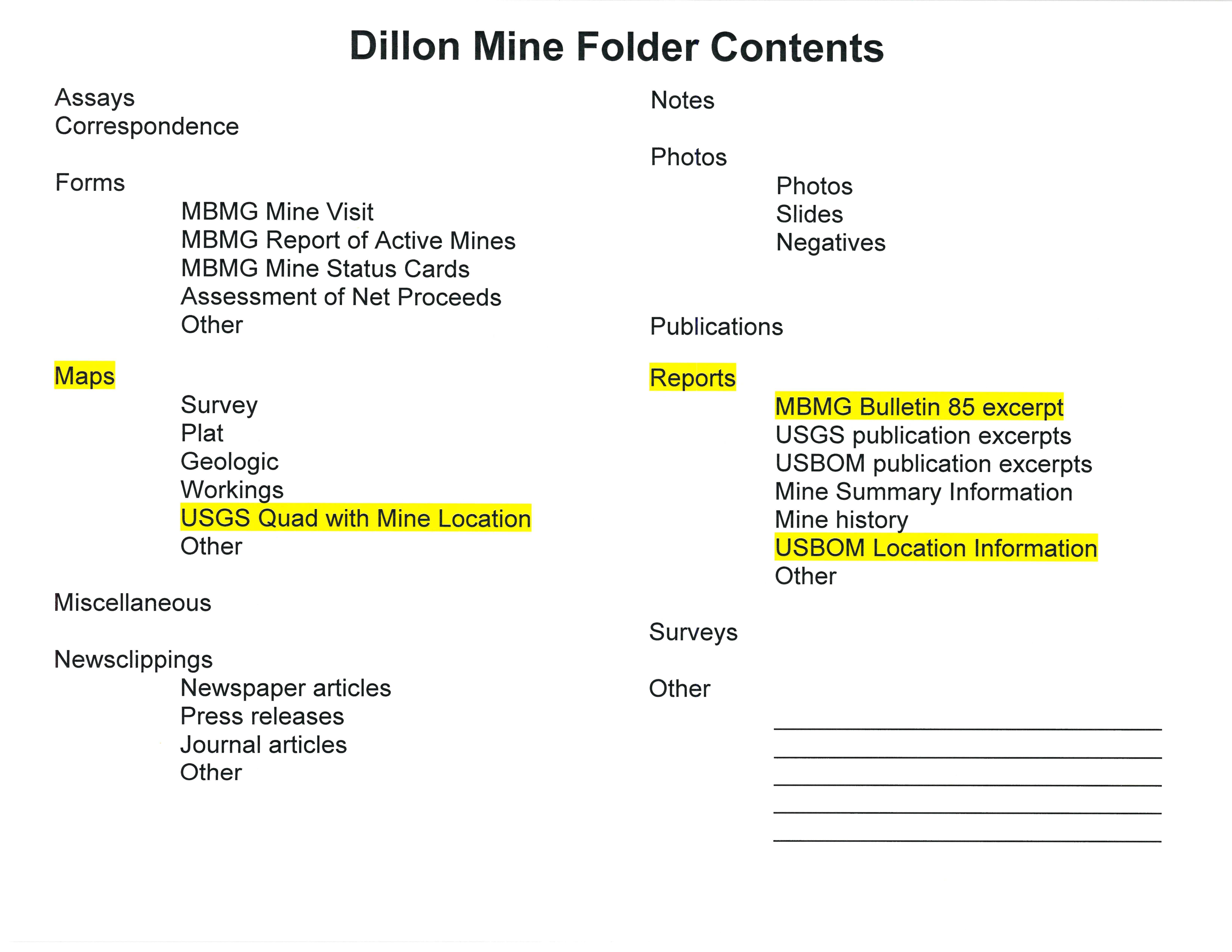 - "Dillon Mine Folder Contents", Beaverhead Mine Documents, Montana Bureau of Mines and Geology