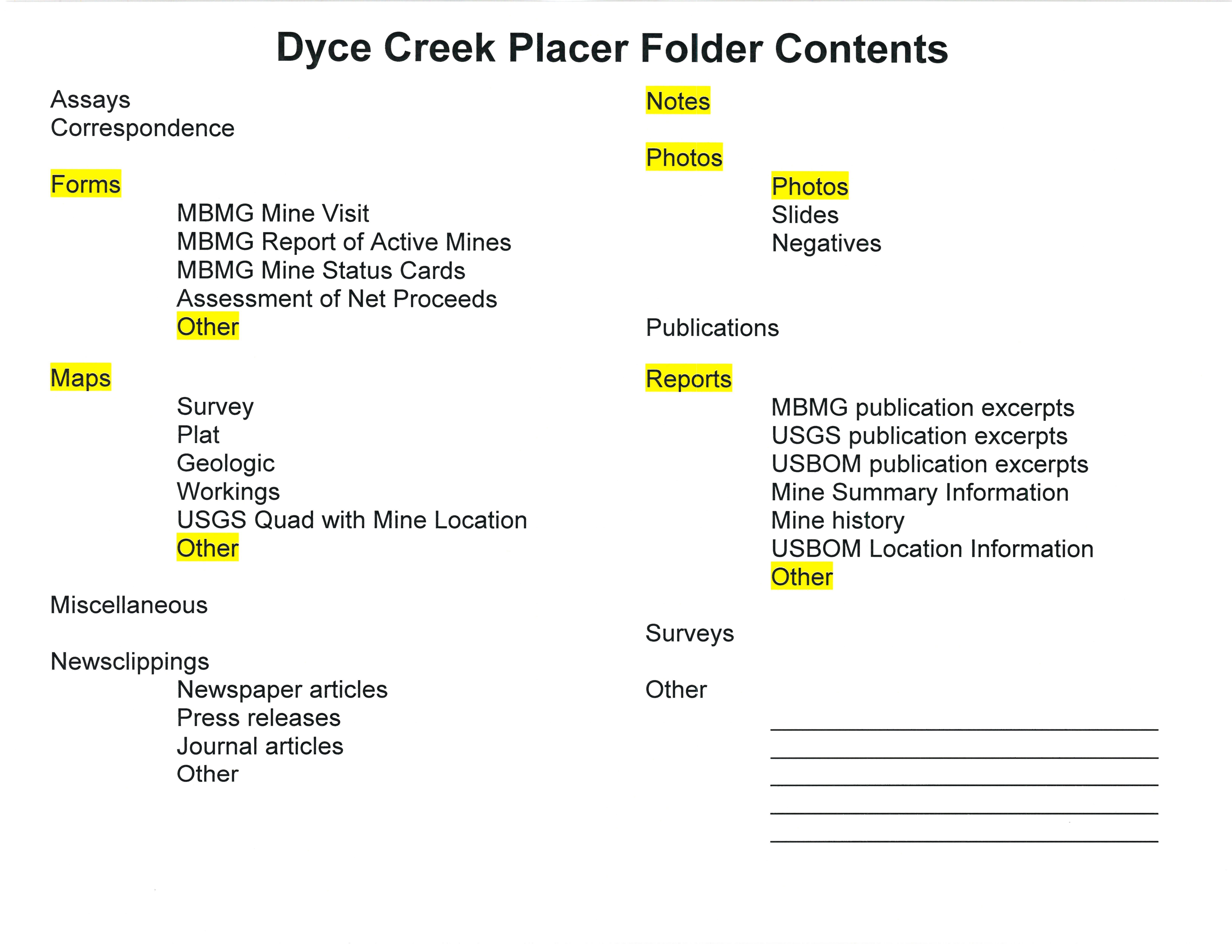 - "Dyce Creek Placer Folder Contents", Beaverhead Mine Documents, Montana Bureau of Mines and Geology
