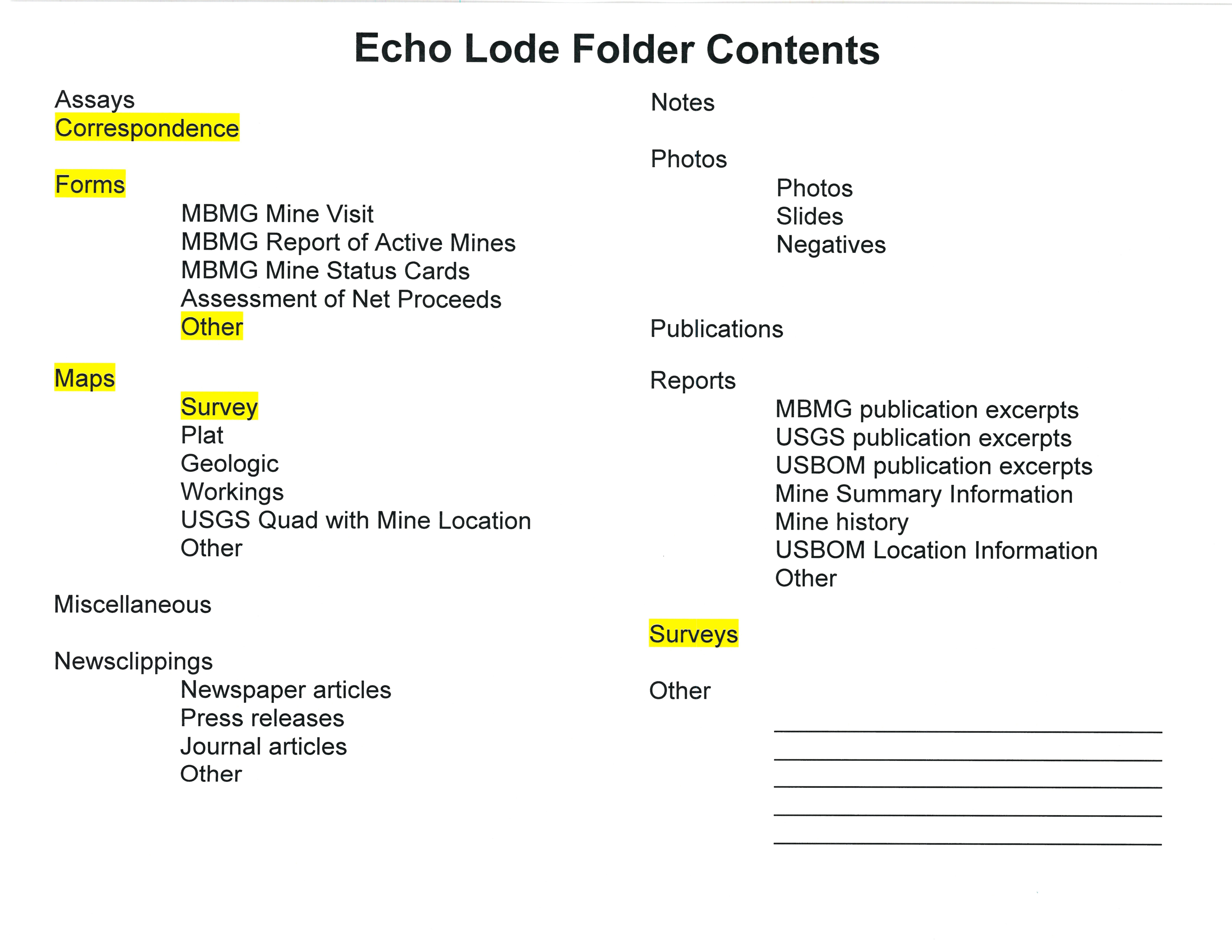 - "Echo Lode Folder Contents", Beaverhead Mine Documents, Montana Bureau of Mines and Geology