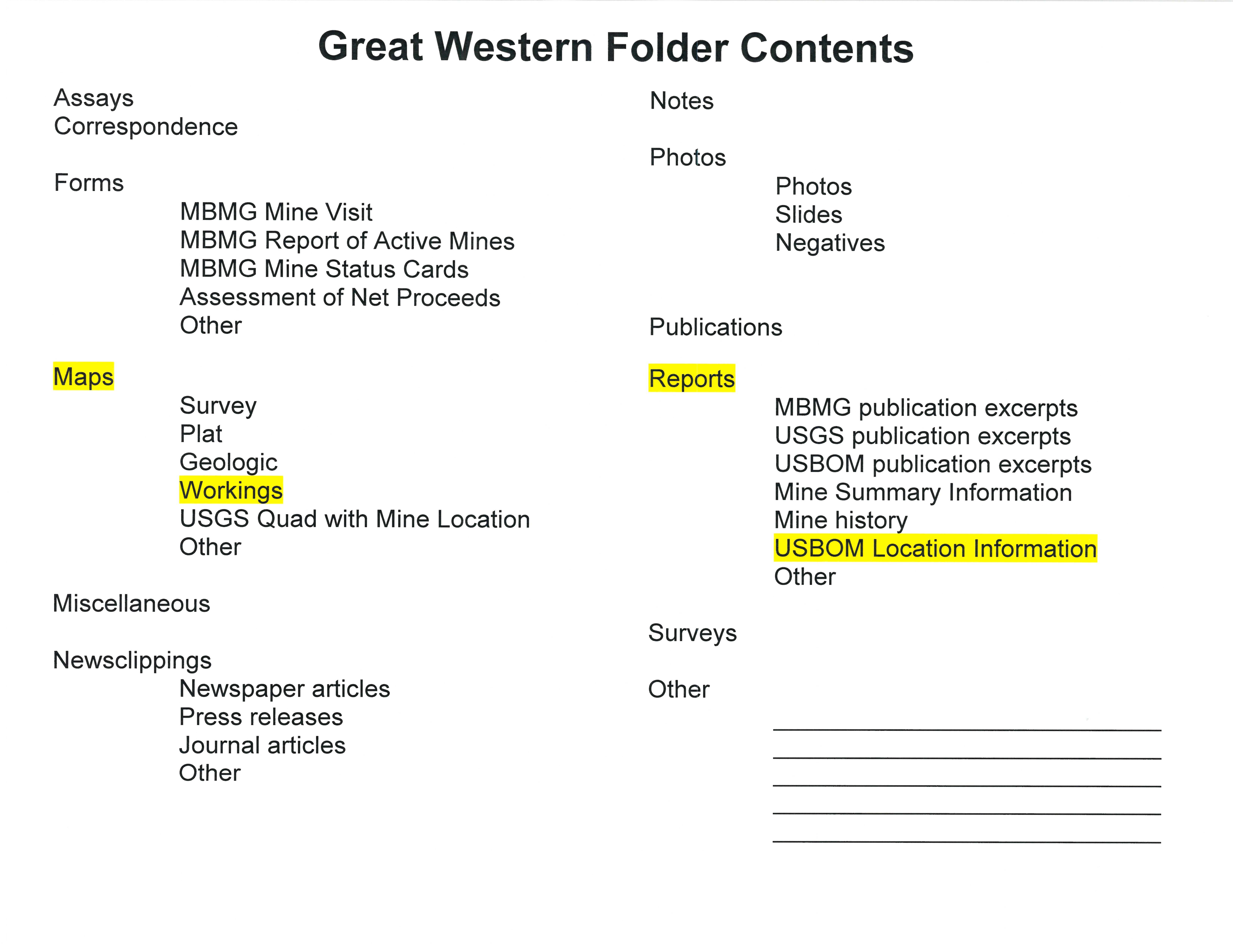 - "Great Western Folder Contents", Beaverhead Mine Documents, Montana Bureau of Mines and Geology