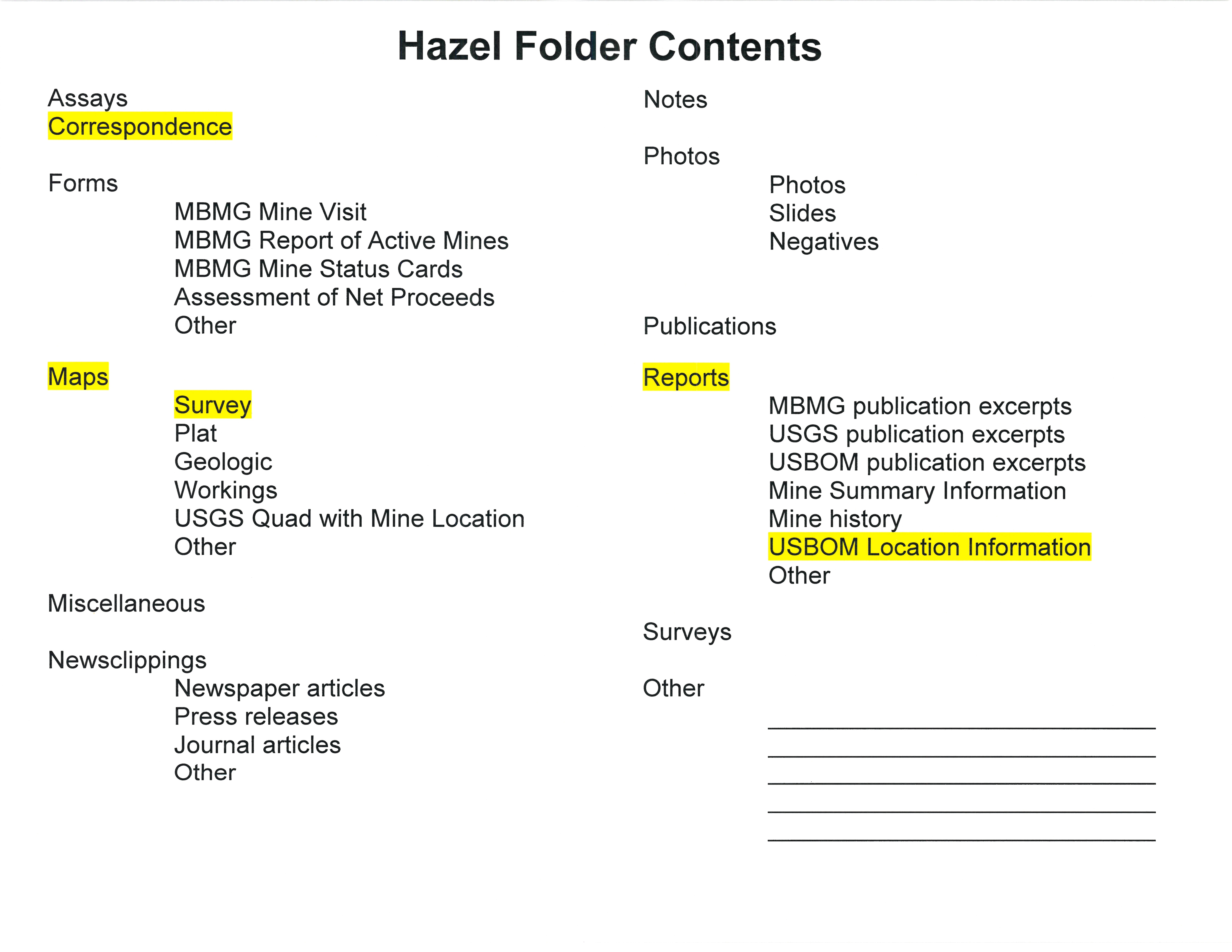 - "Hazel Folder Contents", Beaverhead Mine Documents, Montana Bureau of Mines and Geology