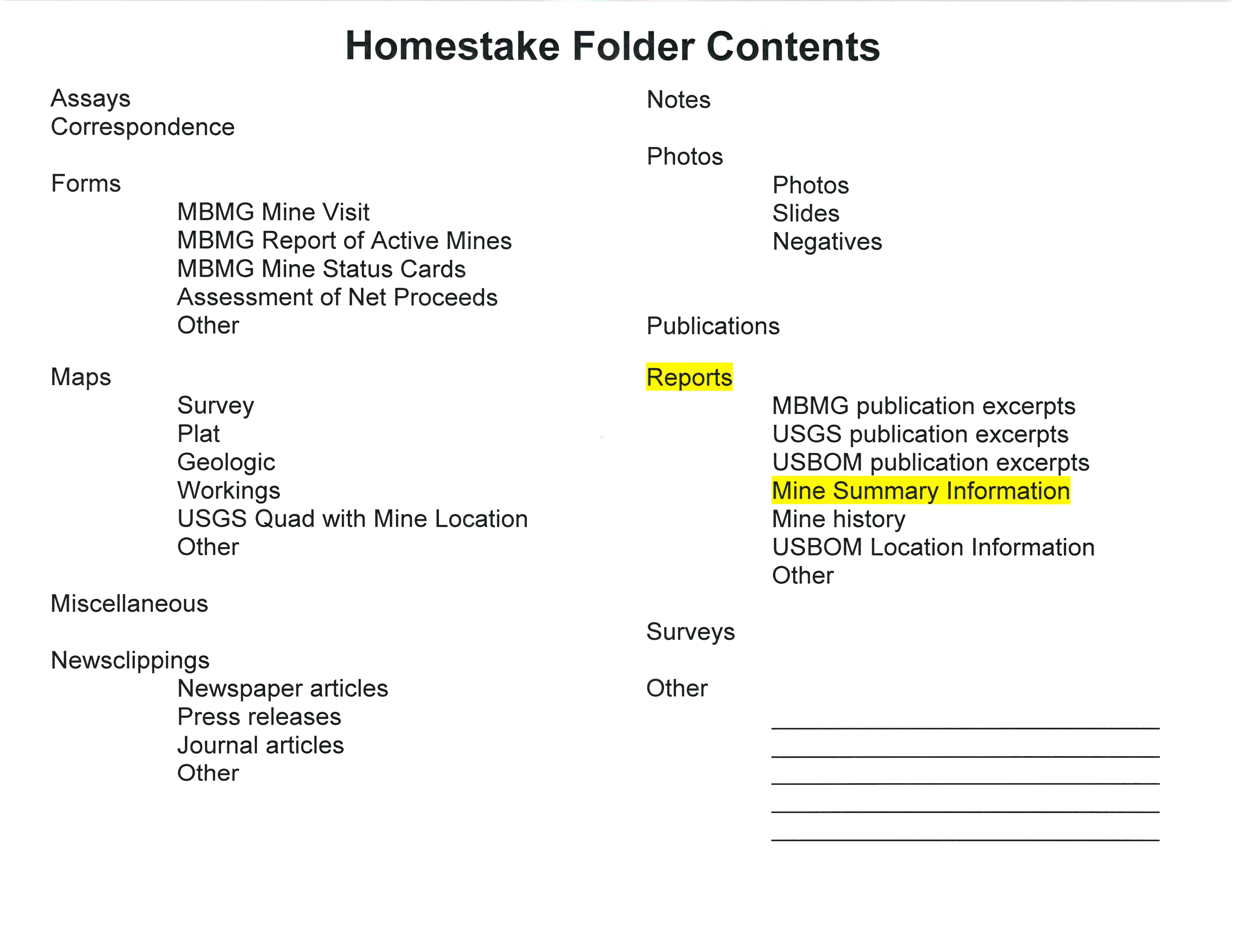 - "Homestake Folder Contents", Beaverhead Mine Documents, Montana Bureau of Mines and Geology