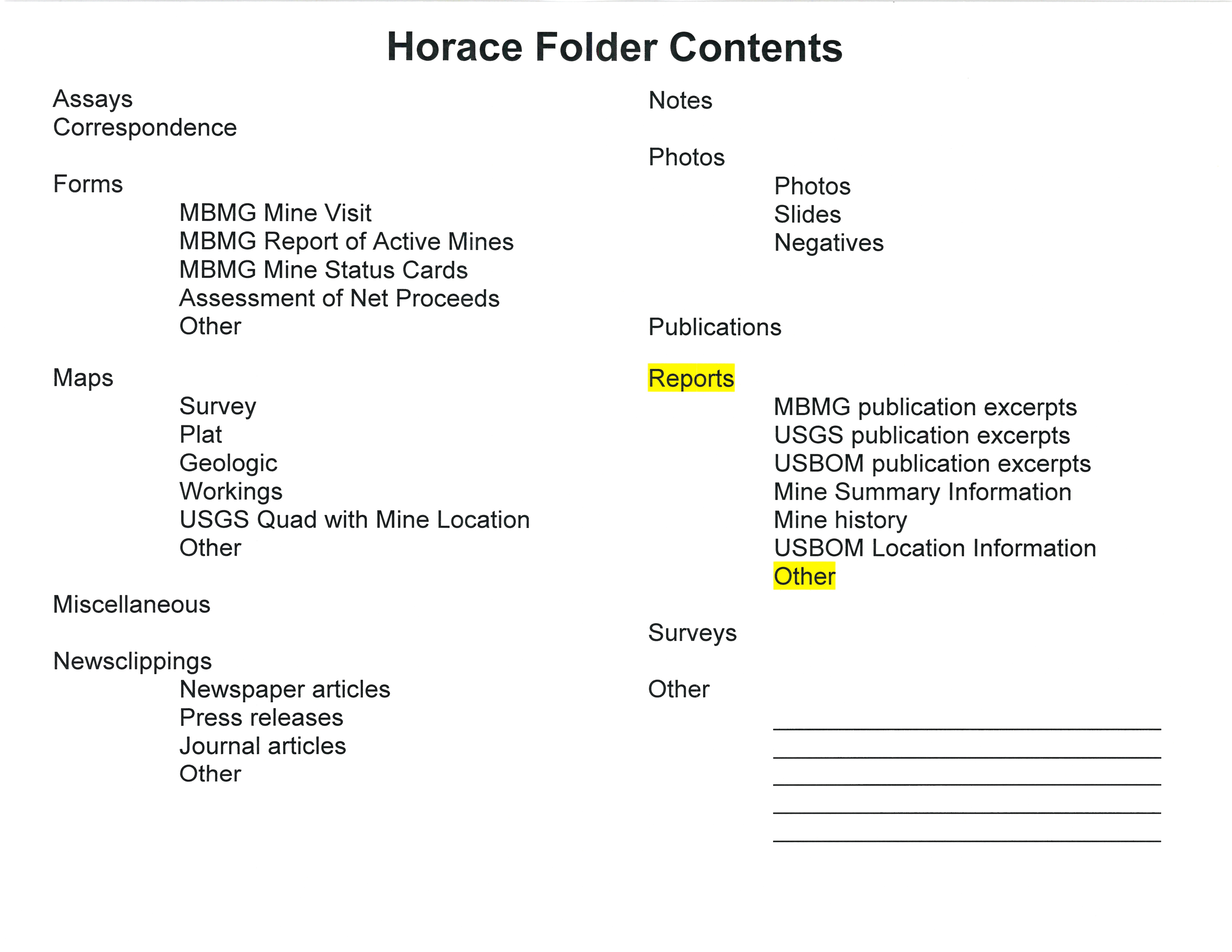 - "Horace Folder Contents", Beaverhead Mine Documents, Montana Bureau of Mines and Geology