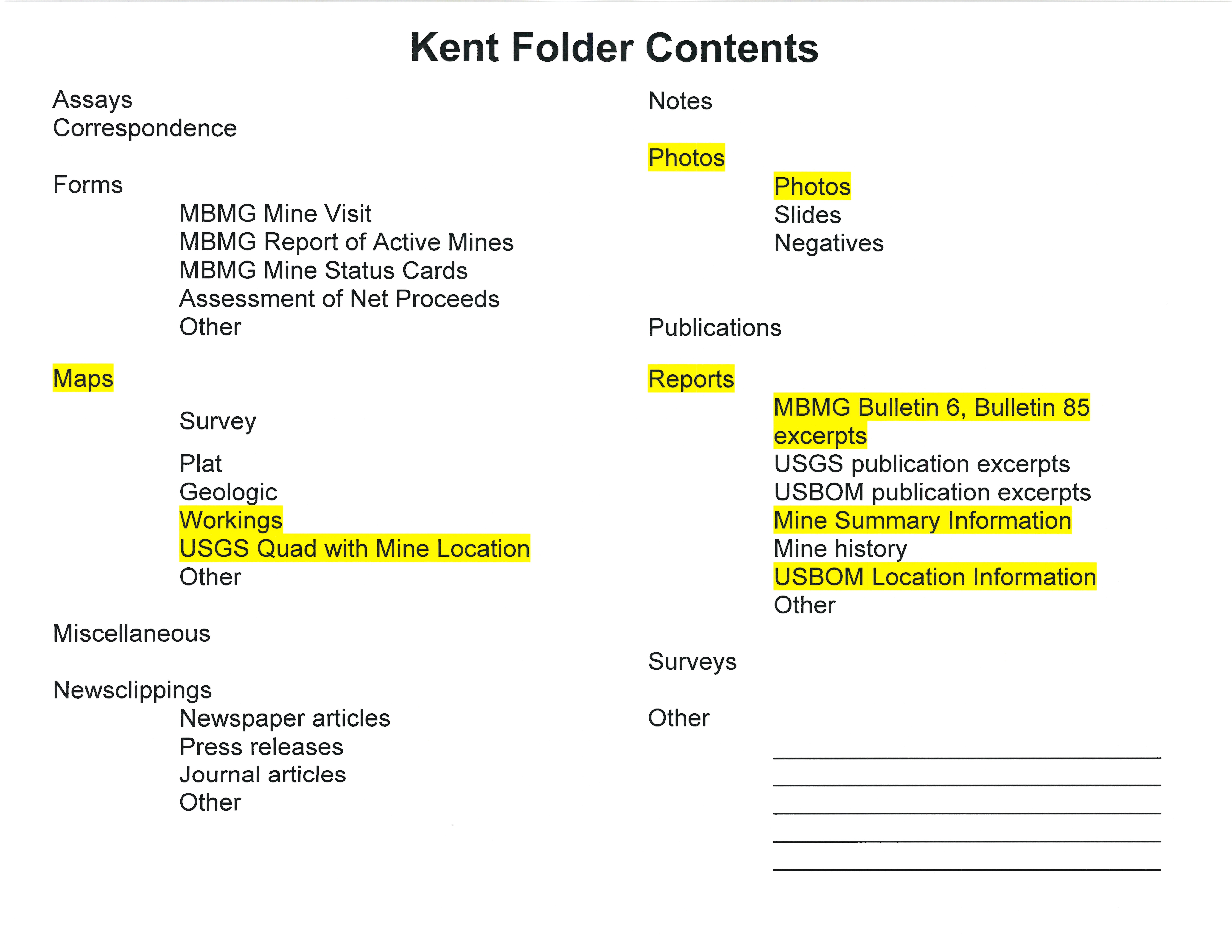 - "Kent Folder Contents", Beaverhead Mine Documents, Montana Bureau of Mines and Geology