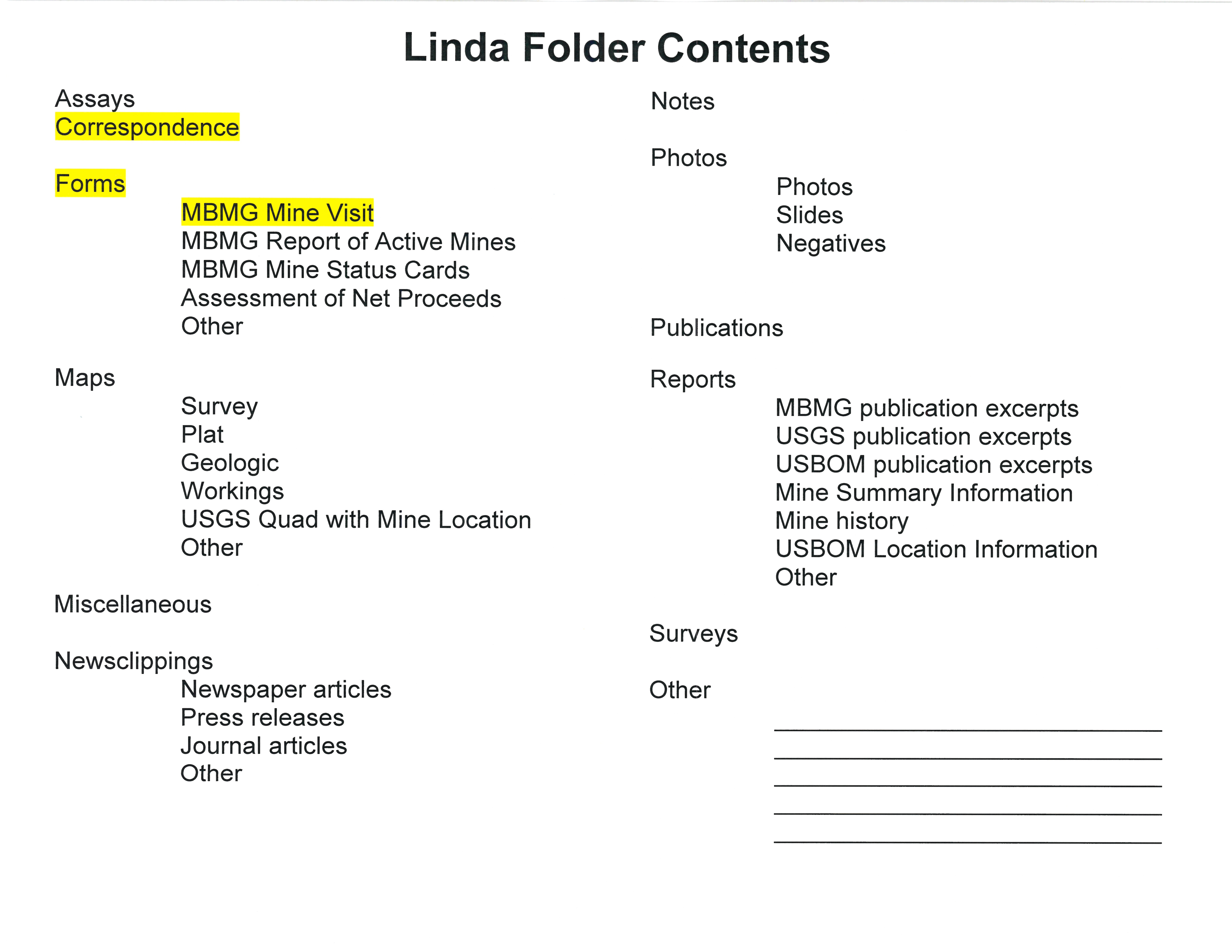 - "Linda Folder Contents", Beaverhead Mine Documents, Montana Bureau of Mines and Geology
