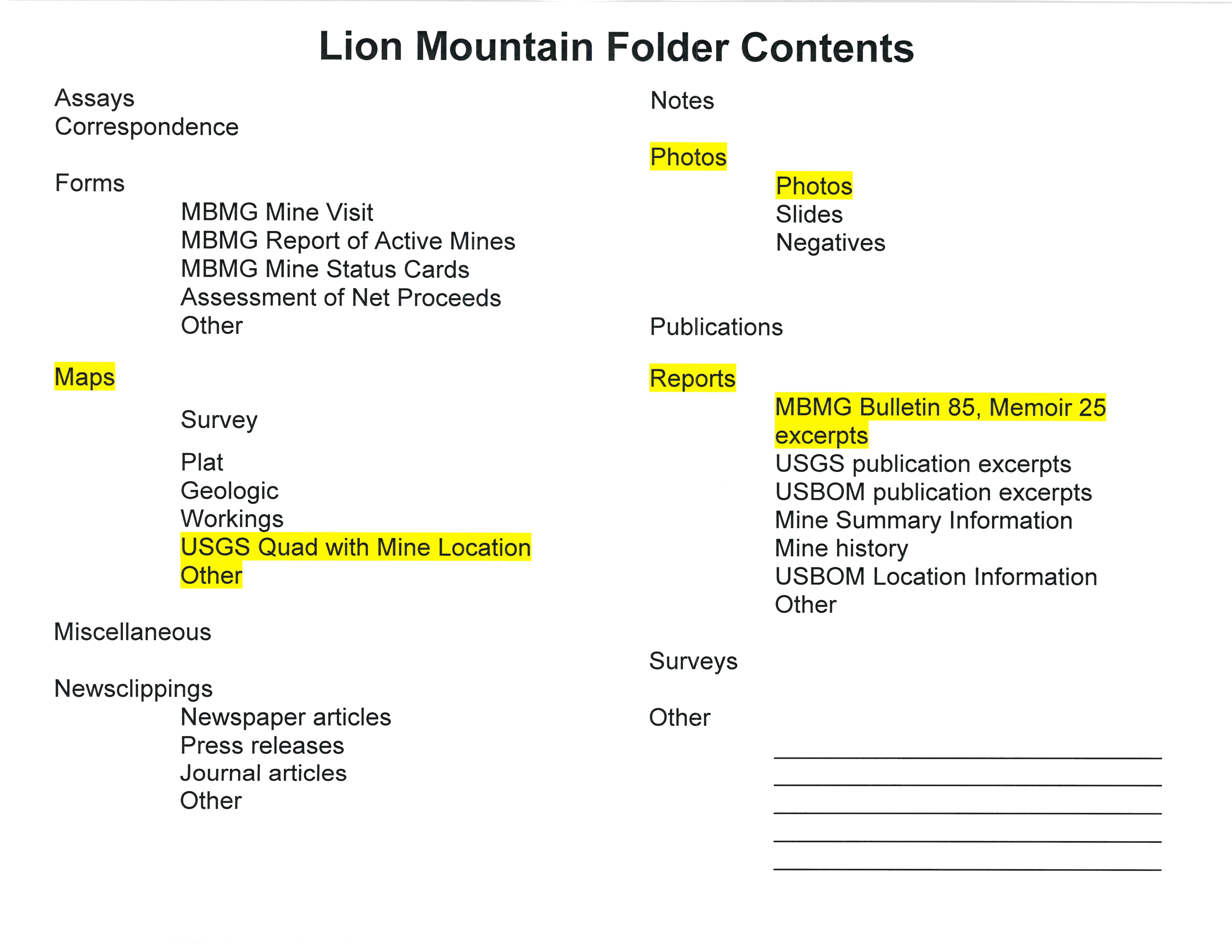 - "Lion Mountain Folder Contents", Beaverhead Mine Documents, Montana Bureau of Mines and Geology