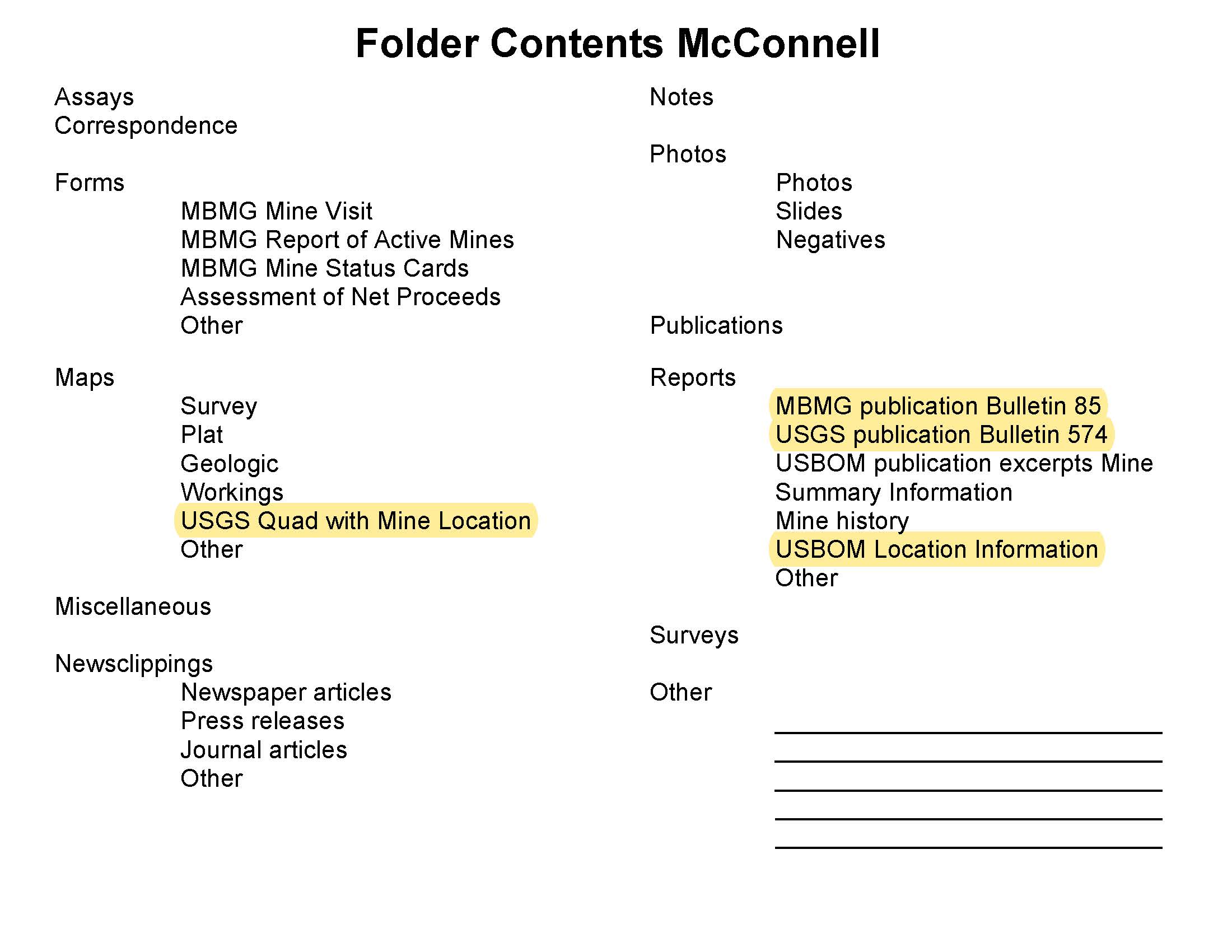 - "McConnell Folder Contents", Beaverhead Mine Documents, Montana Bureau of Mines and Geology