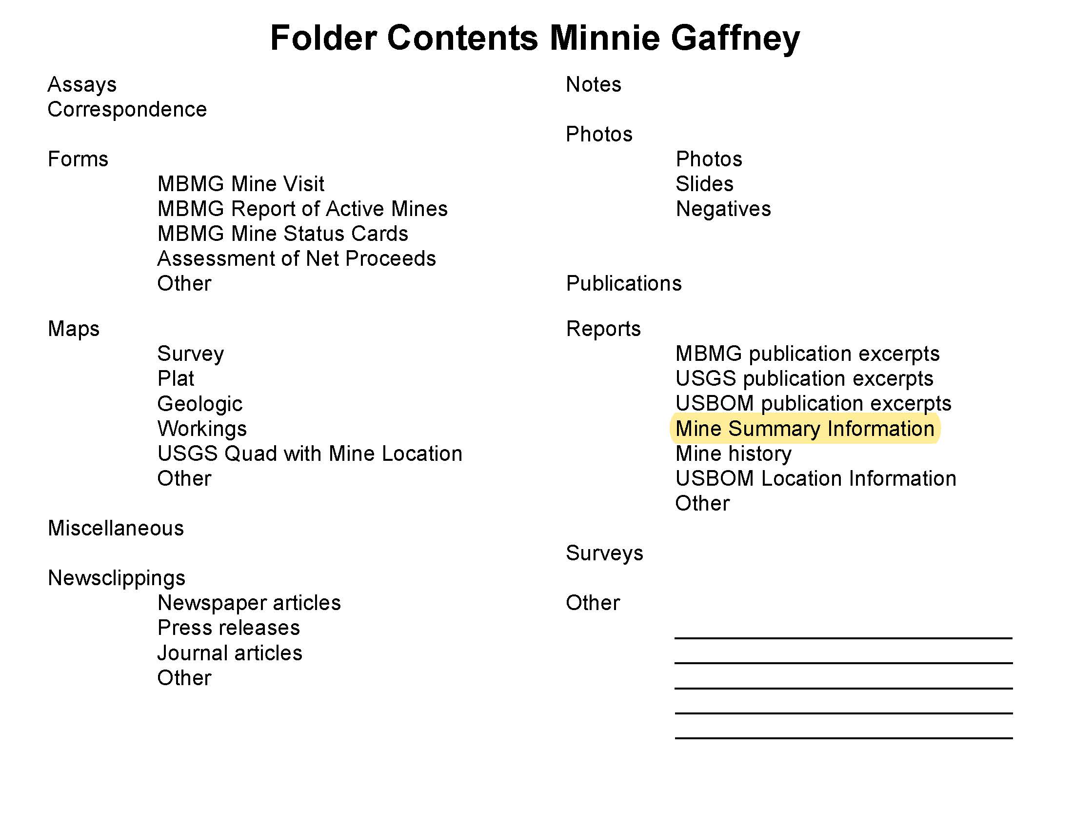 - "Minnie Gaffney Folder Contents", Beaverhead Mine Documents, Montana Bureau of Mines and Geology