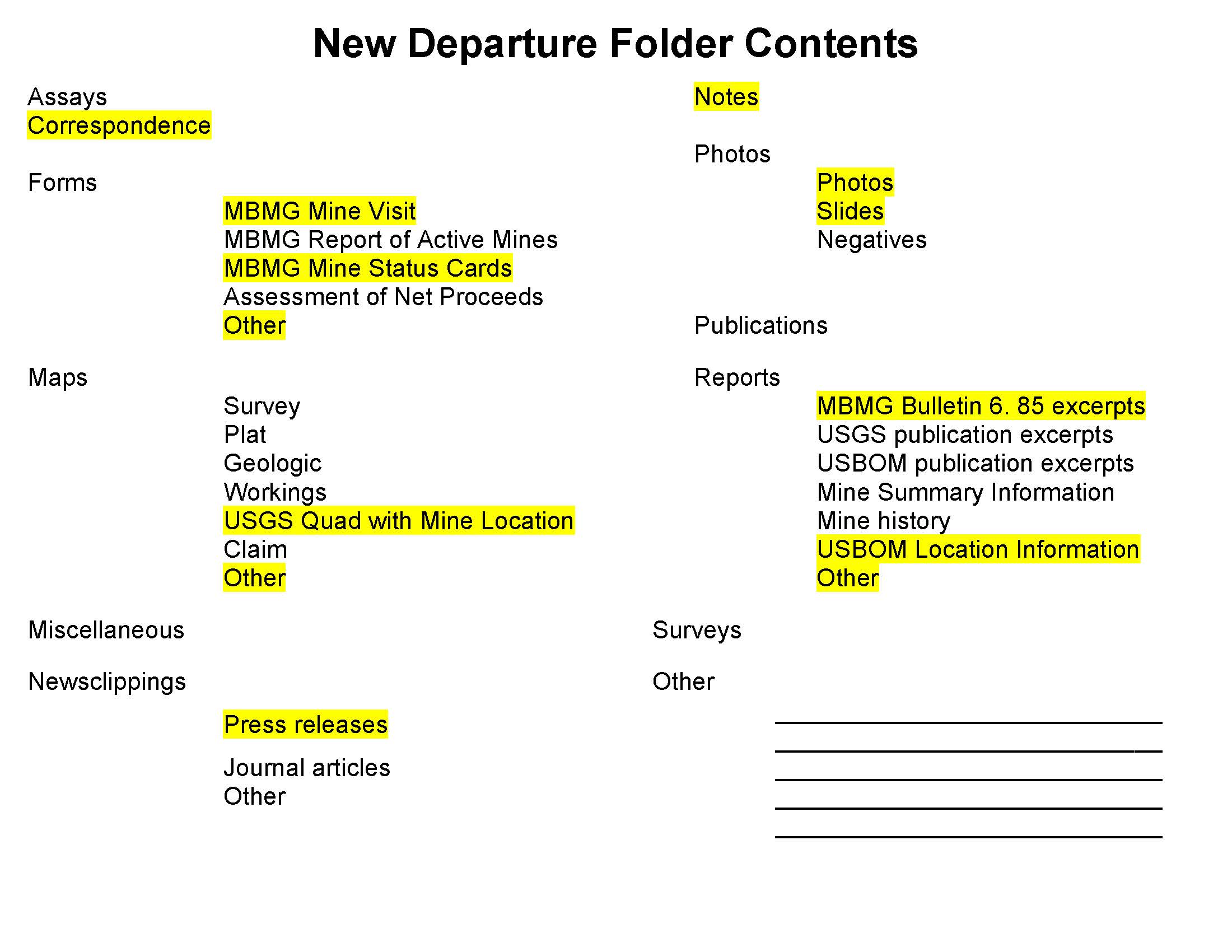 - "New Departure Folder Contents", Beaverhead Mine Documents, Montana Bureau of Mines and Geology