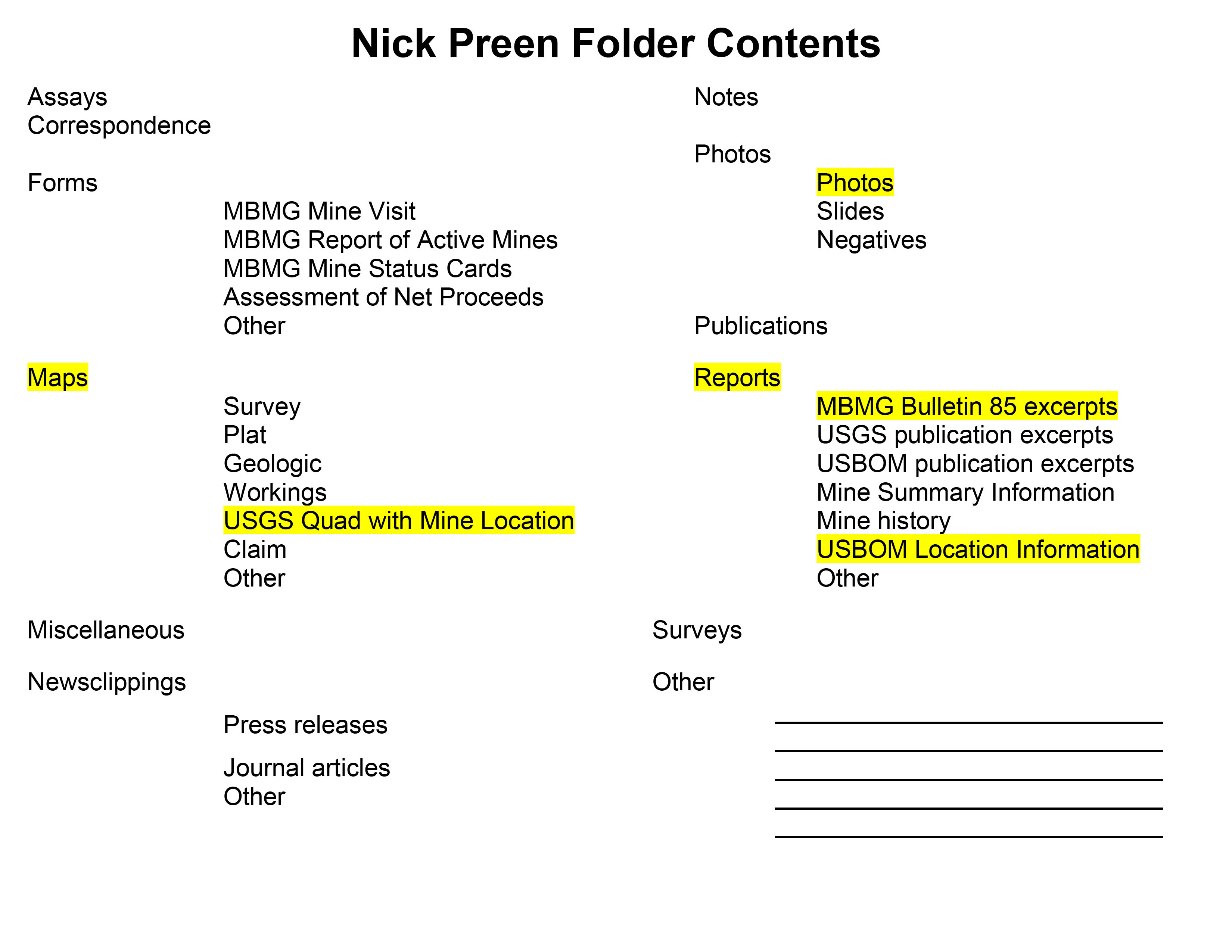 - "Nick Preen Folder Contents", Beaverhead Mine Documents, Montana Bureau of Mines and Geology