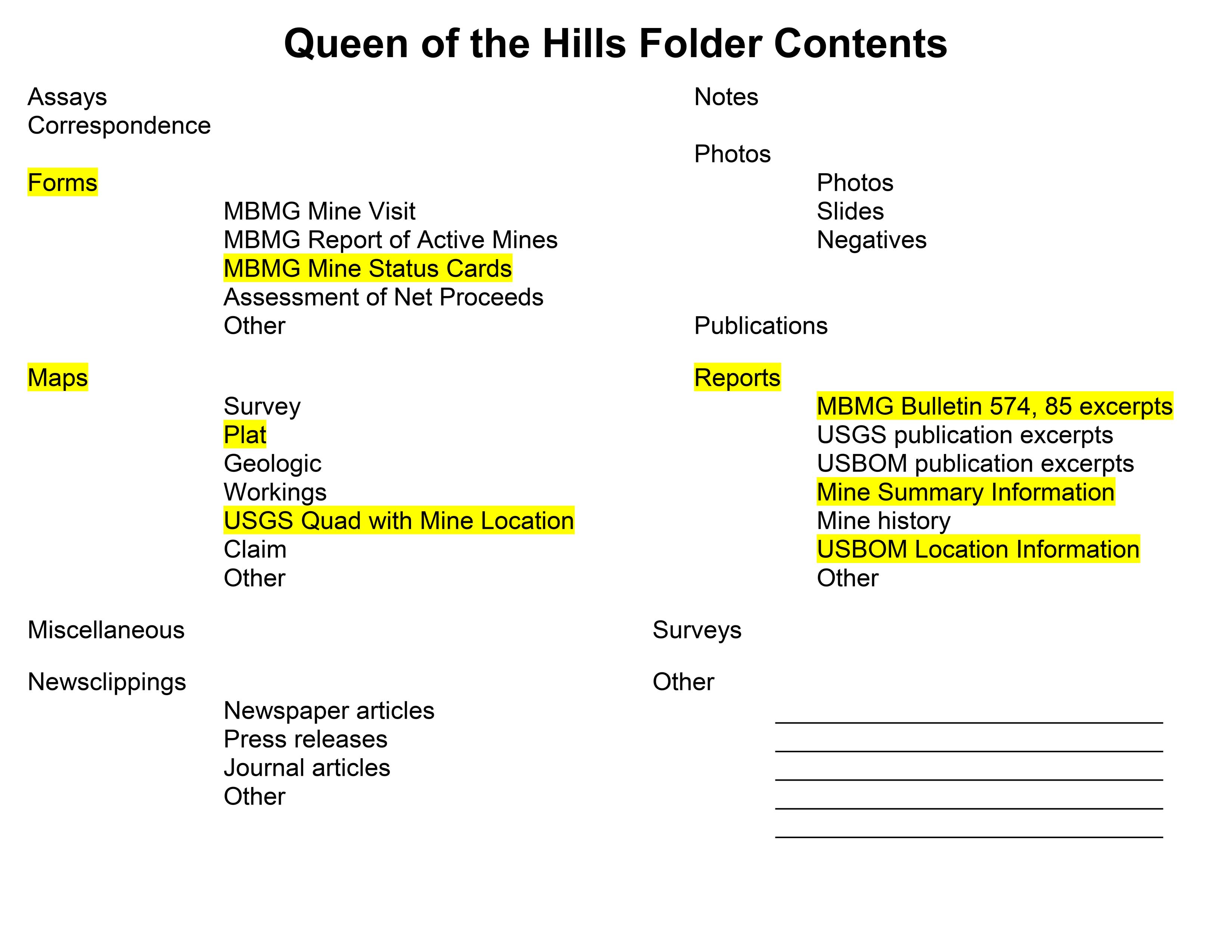 - "Queen Of The Hills Folder Contents", Beaverhead Mine Documents, Montana Bureau of Mines and Geology