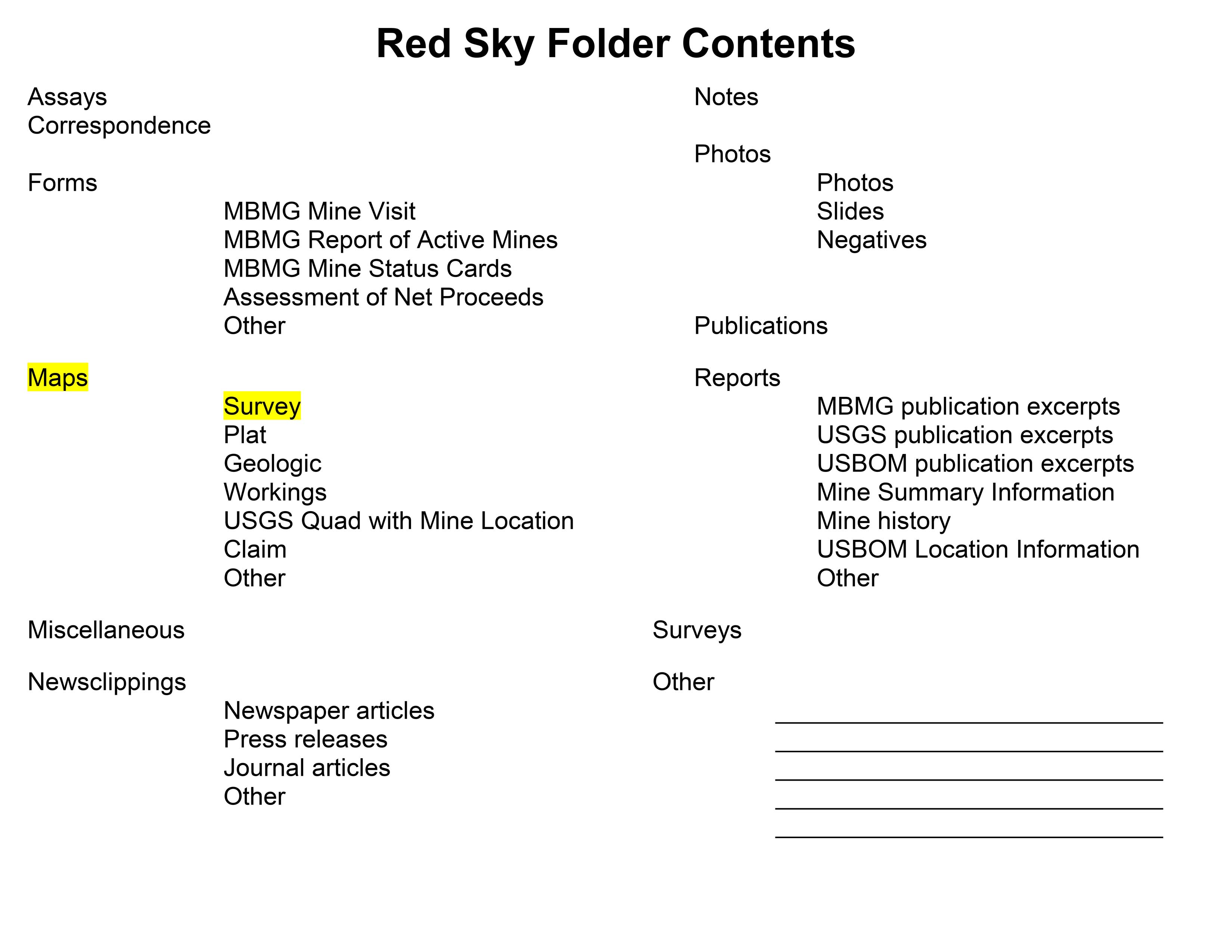 - "Red Sky Folder Contents", Beaverhead Mine Documents, Montana Bureau of Mines and Geology