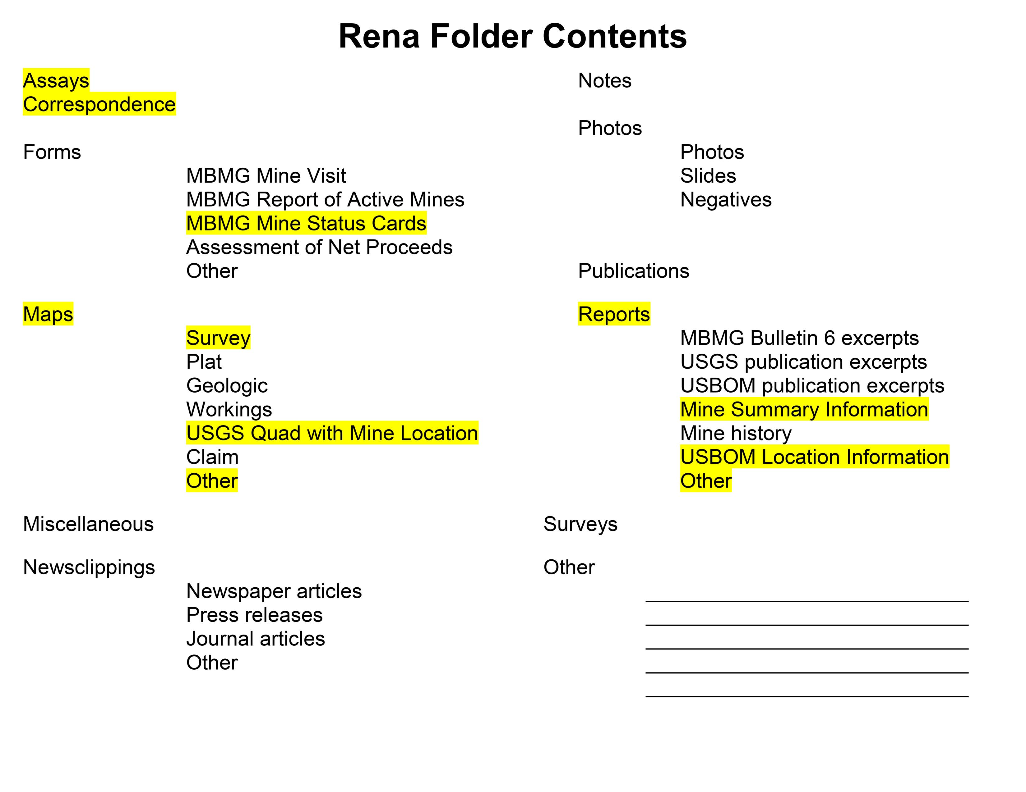 - "Rena Folder Contents", Beaverhead Mine Documents, Montana Bureau of Mines and Geology