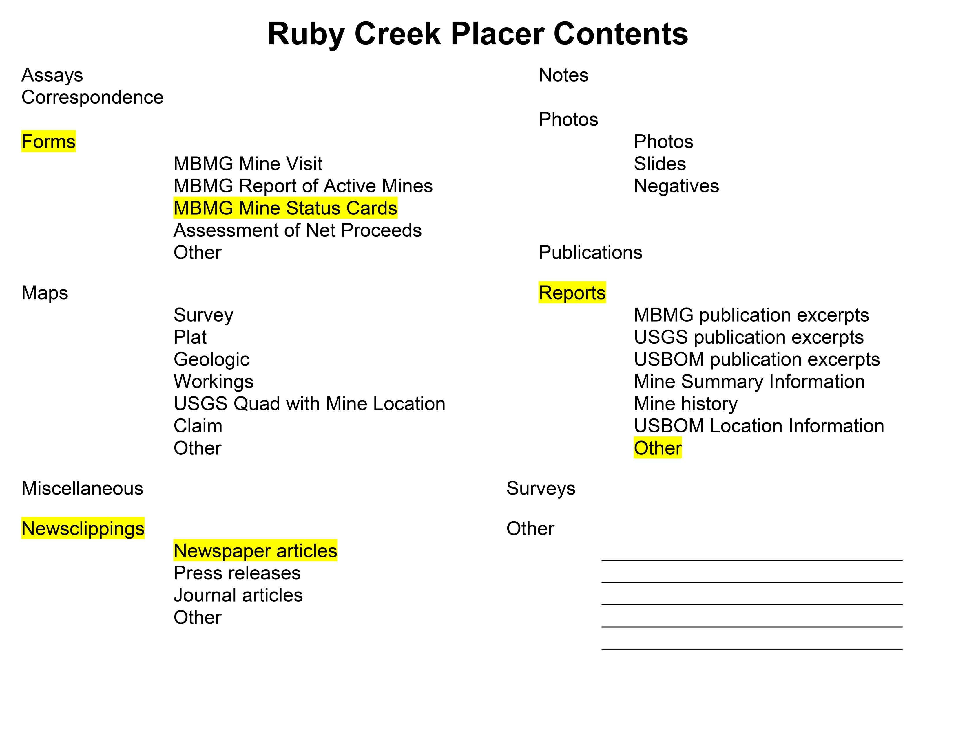 - "Ruby Creek Placer Folder Contents", Beaverhead Mine Documents, Montana Bureau of Mines and Geology