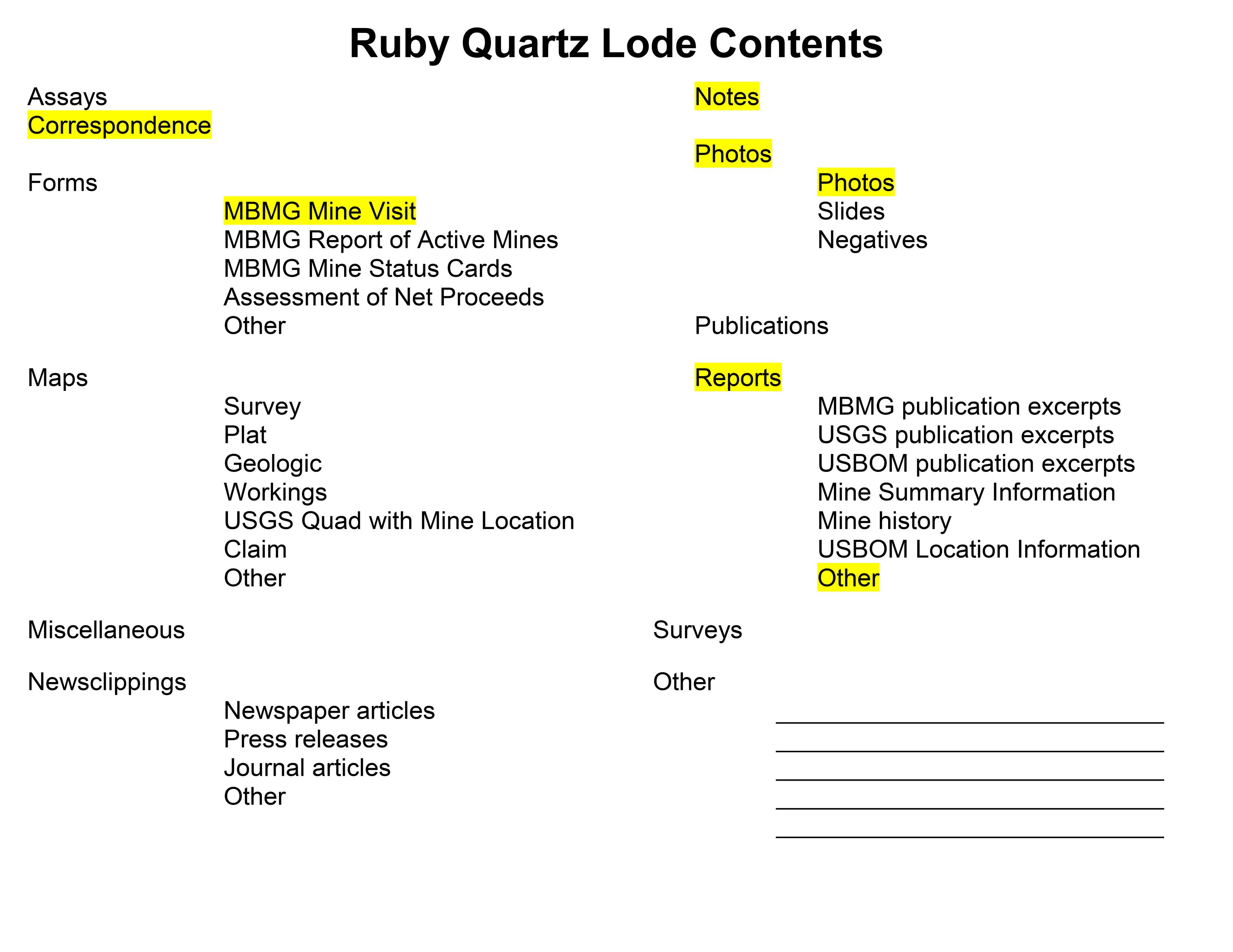 - "Ruby Quartz Lode Folder Contents", Beaverhead Mine Documents, Montana Bureau of Mines and Geology