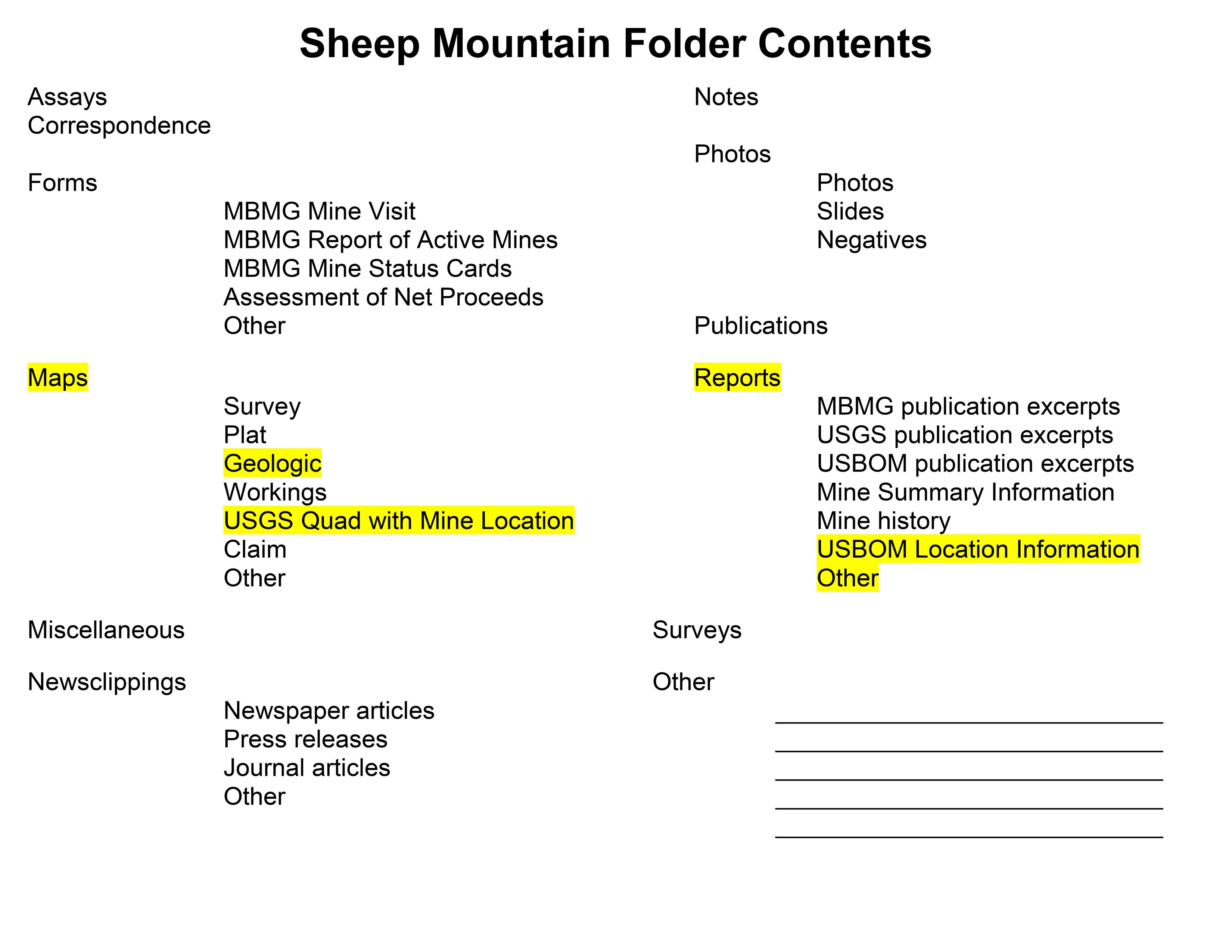 - "Sheep Mountain Folder Contents", Beaverhead Mine Documents, Montana Bureau of Mines and Geology