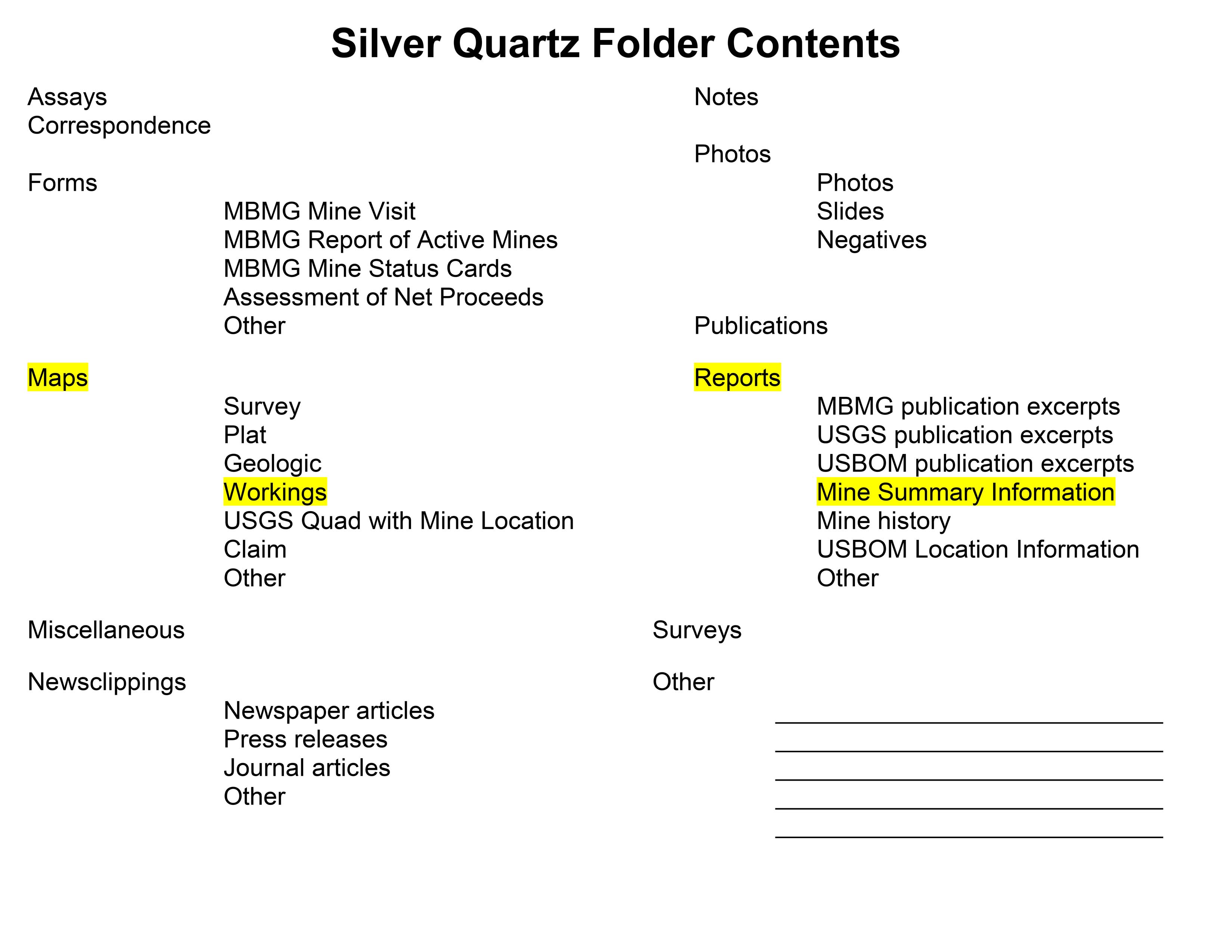 - "Silver Quartz Folder Contents", Beaverhead Mine Documents, Montana Bureau of Mines and Geology