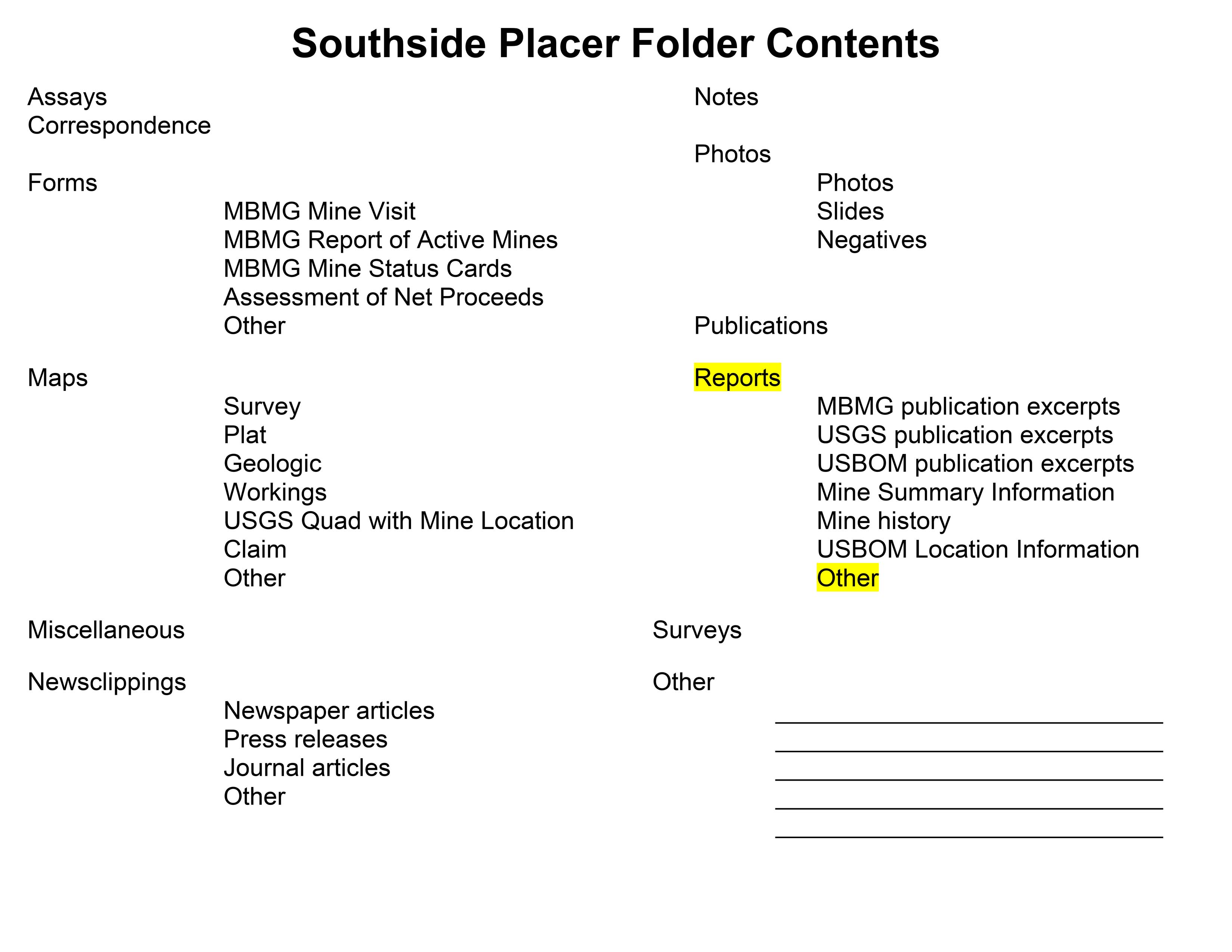- "Southside Placer Folder Contents", Beaverhead Mine Documents, Montana Bureau of Mines and Geology
